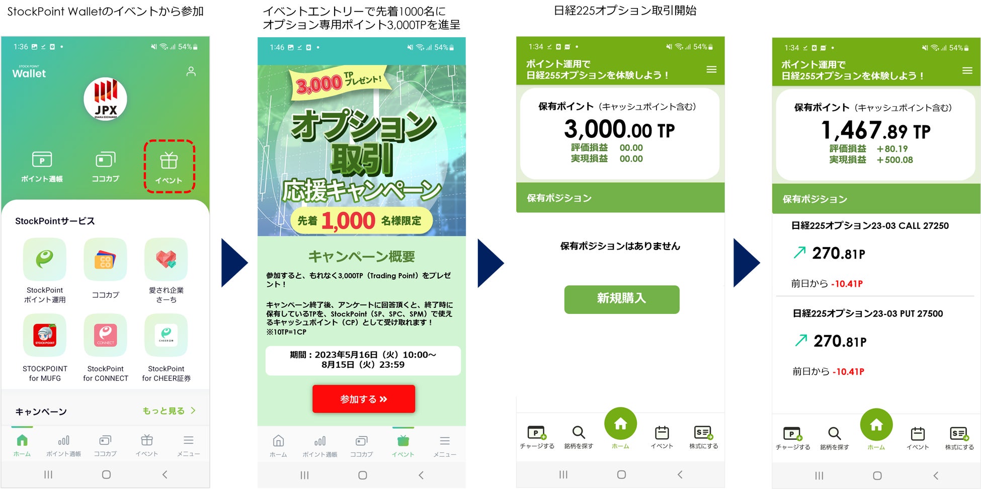 今回のキャンペーンは、StockPoint Wallet※3からエントリーした先着1,000名の方を対象に、当キャンペーンで利用可能なオプション取引専用ポイント3,000TPを進呈し、実際に日経225オプションをポイント運用で体験頂くことで、オプション取引のしくみや利用方法を知ってもらう事が狙い。期間は、2023年5月16日(火)から8月15日(火)の3か月間、じっくり体験して日経225オプション取引の理解を深めてほしい。