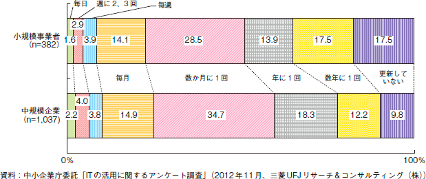 さらに深刻なのは、更新頻度です。同じ調査によると、ホームページの更新頻度は小規模企業で「更新していない」「数年に1回」「1年に1回」を合わせると、48.9%。中規模企業では40.3%となっています。つまり、中小零細企業では「ホームページはつくったものの、ほとんど更新していない」が半数近いということです。つまり、作ったは良いけれど、全くと言って良いほど機能していない中小零細企業が半数近いということなのです。