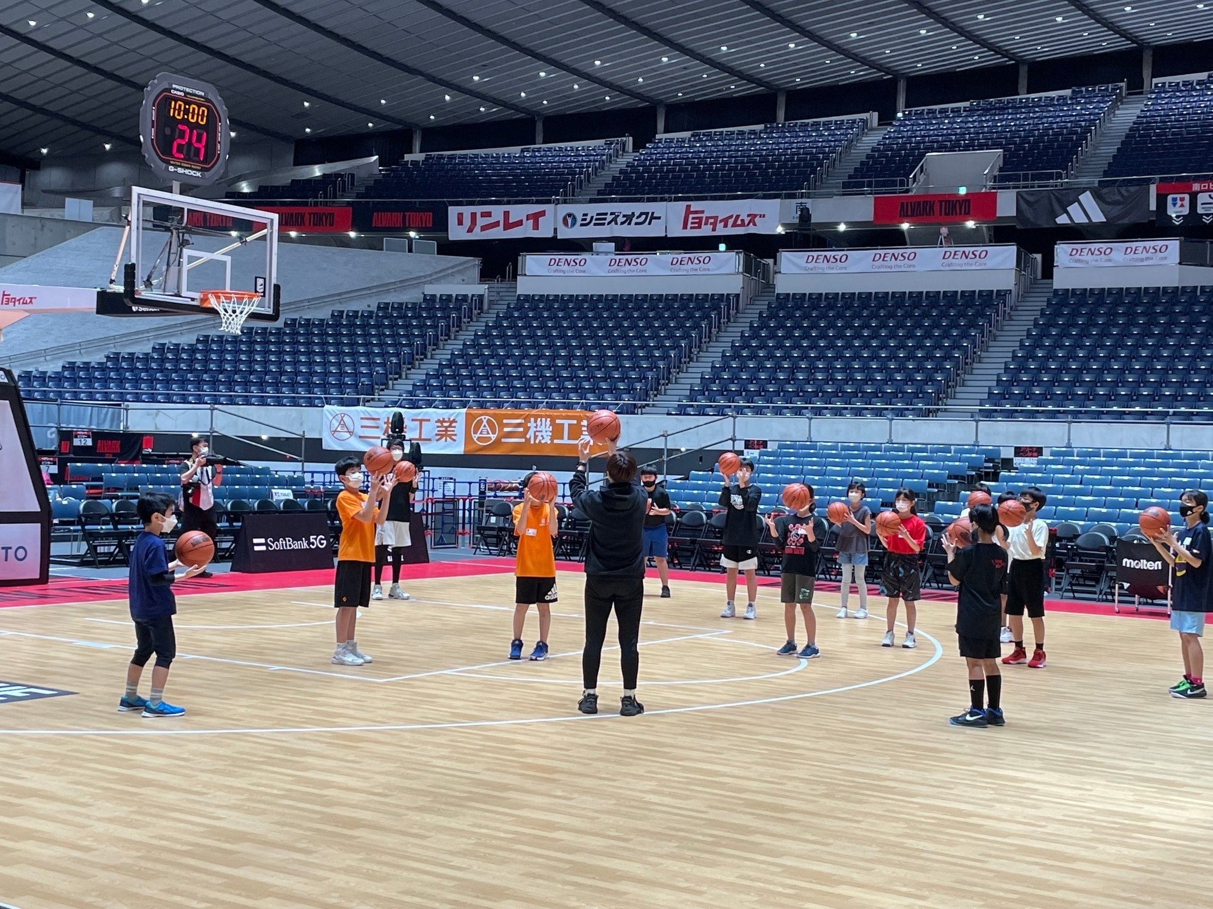 事前抽選に当選された小学1年生から6年生がバスケ教室とチアダンス教室にそれぞれ参加し、アルバルク東京のアカデミーコーチやアルバルクチアから本格的なレッスンを受けました。