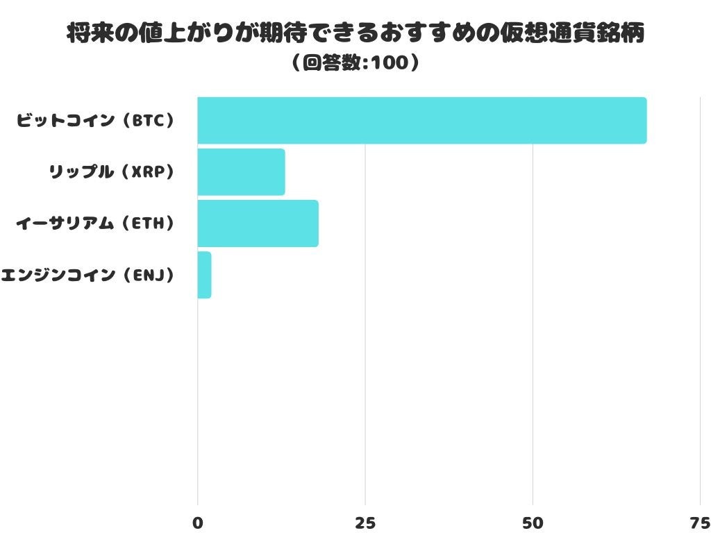 将来の値上がりが期待できるおすすめの仮想通貨銘柄は何かをアンケートにて調査したところ、1位は「ビットコイン(BTC)」でした。