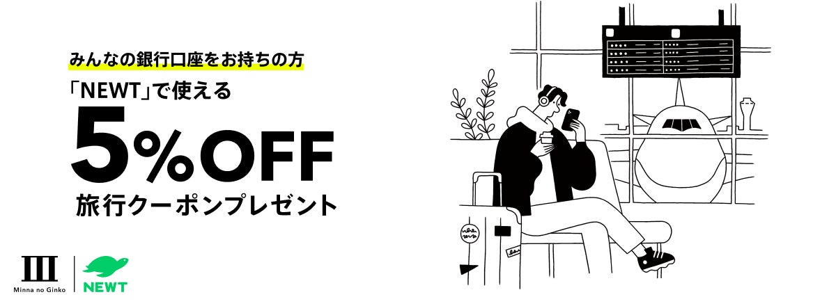 | プレゼント内容 | 海外旅行予約アプリ「NEWT」で使える5%オフクーポン ※「NEWT」でツアーをお申込みの際に利用できるクーポンコードを、みんなの銀行アプリ「お知らせ」に掲載、ご提供します |