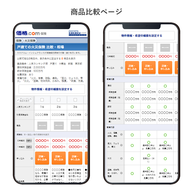 価格.com保険では、戸建て住宅やマンションの基本情報や希望の補償内容などを入力いただくとすぐに保険料が比較できるサービスを提供しています。