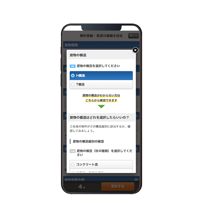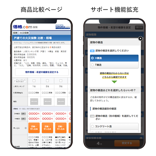 商品の条件を設定する際に、建物の構造選択をサポートする機能や建物評価額の試算をサポートする機能を拡充しました。これによりお客さまは、スムーズに保険比較を進めることができます。