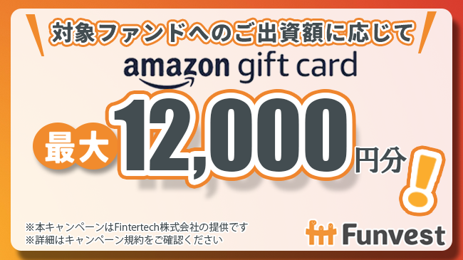 本ファンドへ出資していただいた投資家の皆様を対象として、出資額に応じて最大12,000円分のAmazonギフトカードをプレゼントするキャンペーンも併せて実施いたします。