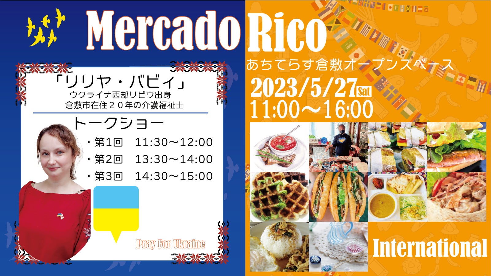 いろいろな国の美味しいものがやってきます。また、ウクライナ出身、倉敷市在住の「リリヤ・バビィ」さんのトークショーなども開催いたします。是非ご来場ください