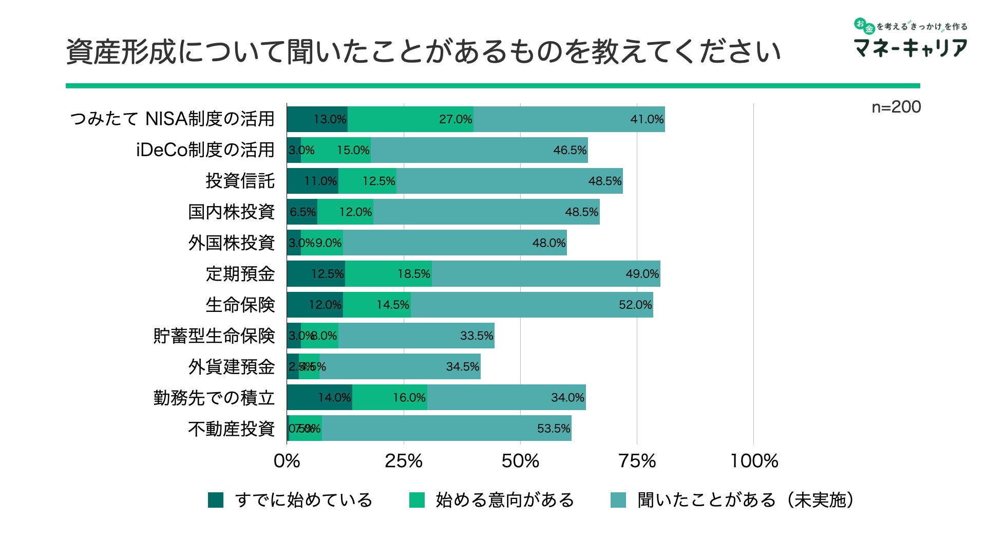 「資産形成について、聞いたことがあるものを教えてください。」と質問したところ「つみたてNISA制度の活用」に聞いたことがあるが81%、「iDeCo制度の活用」「投資信託」「定期預金」等の言葉も70%以上の人が聞いたことがあると回答し資産形成への意識が高まっている印象です。