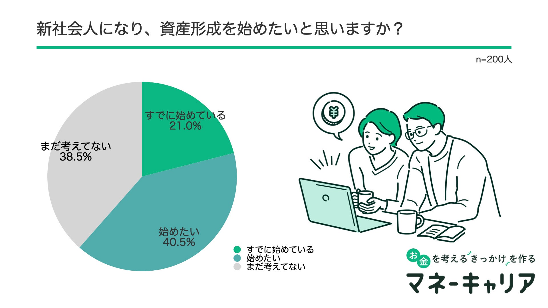 「新社会人になり、資産形成を始めたいと思いますか?」と質問したところ、21%の人が「すでに始めている」40.5%の人が「始めたい」となり、将来に対する不安から資産形成に対する意識が高まっている印象です。