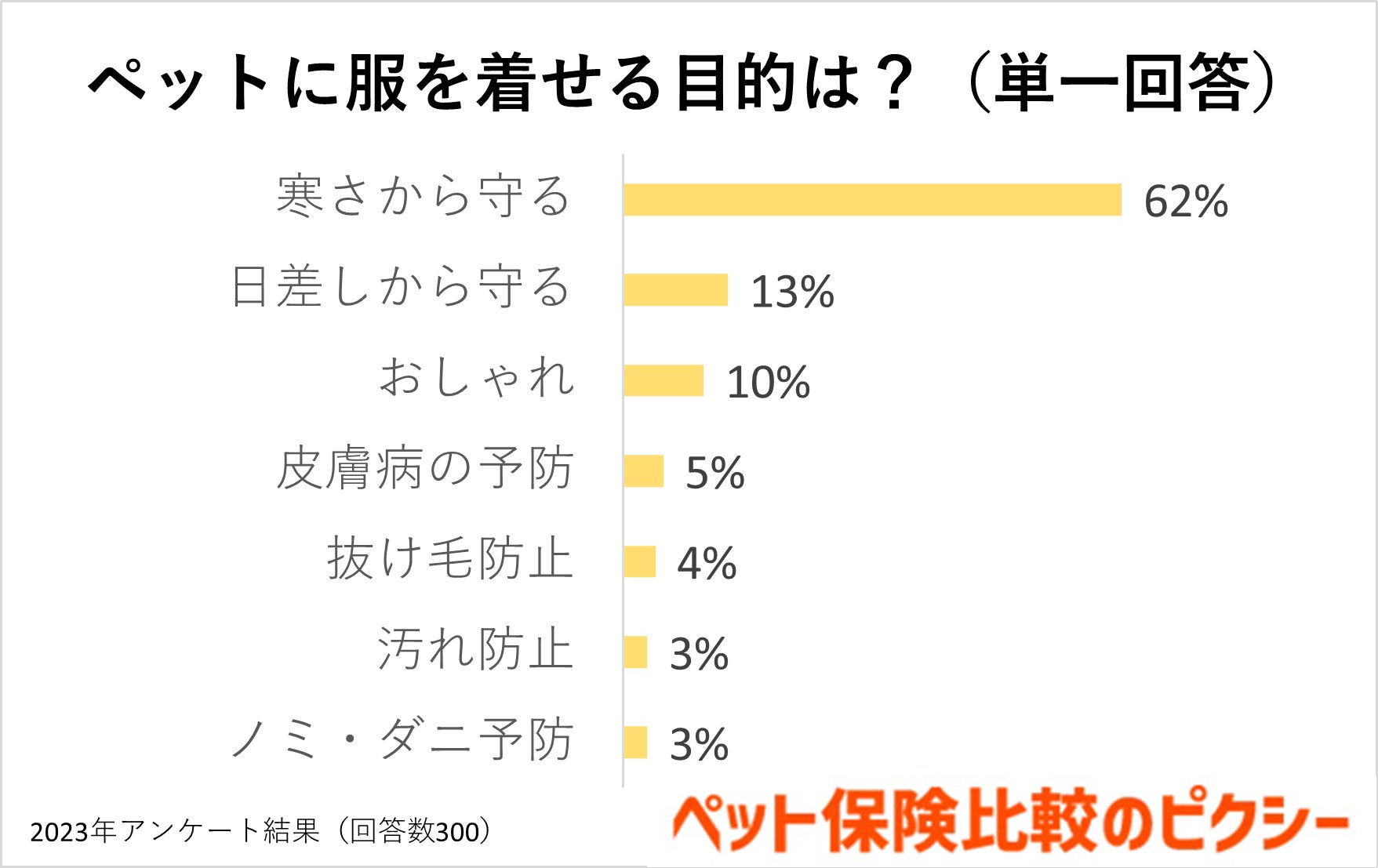 ペットに服を着せる目的について質問すると、全体の62%が「寒さから守る」ためと回答し、ほかの回答を大きく引き離して票を集めました。犬や猫は、人間のように自ら温度調節ができません。そのため、多くの飼い主さまが、ペットの健康のために体温調整に気を遣っているのでしょう。
