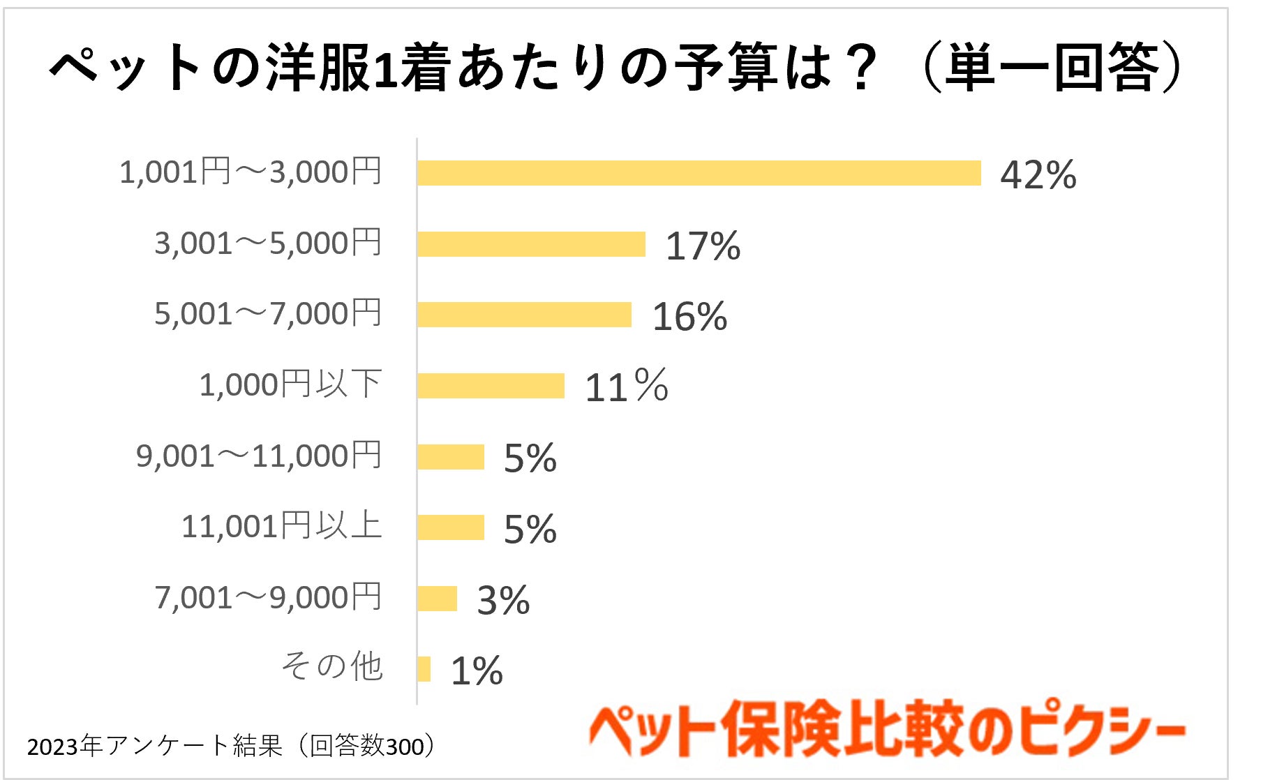 5位は「9,001~11,000円(5%)」、6位は「11,001円以上(5%)」でした。1万円前後の洋服を選んでいる飼い主さまは全体の1割と少ない結果となっています。高価格帯の洋服はペットには必要ないと思う方も多いのかもしれません。