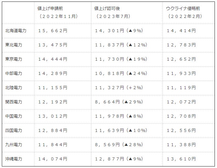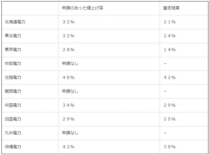 といった、前例にとらわれない極めて厳格な査定を行いました。その結果、査定後の標準的なご家庭における電気料金の値上げ率は、以下のとおりとなりました。