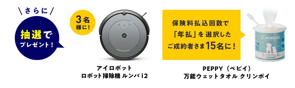 本キャンペーンは、期間中にペット保険にお申込みいただいたご成約者さま全員に、ローソン店舗で「森永製菓 チョコモナカジャンボ」と引き換えできる電子ギフトチケットをプレゼントします。また、抽選で3名様に人気のロボット掃除機が当たるほか、さらに、保険料払込回数で「年払」を選択いただいたご成約者さまの中から抽選で15名様に人気のペット用品が当たります。