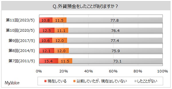外貨預金の利用経験者は2割強です。現在利用している人は1割強、世帯収入が高い層で比率が高くなっています。