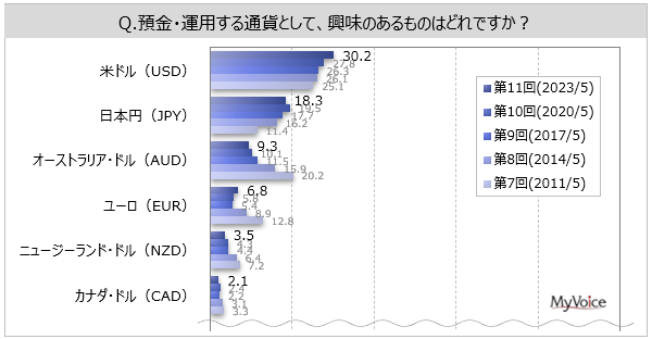 預金・運用する通貨として興味があるものは(複数回答)、「米ドル(USD)」が30.2%、「日本円(JPY)」が18.3%となっています。過去調査と比べて、「オーストラリア・ドル(AUD)」は減少傾向です。
