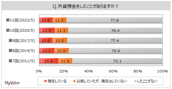 外貨預金の利用経験者は2割強です。現在利用している人は1割強、世帯収入が高い層で比率が高くなっています。
