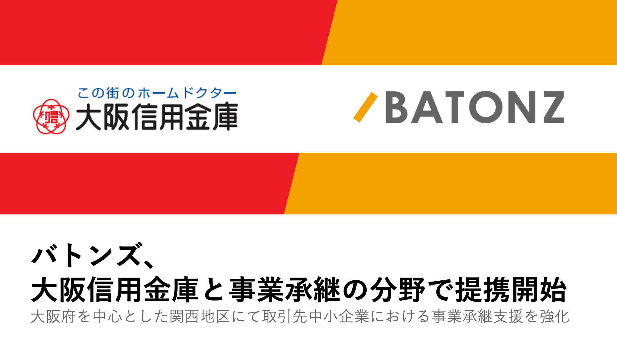 後継者のいない中小企業・小規模事業者の第三者承継・M&Aを推進するため、大阪府に本社を置く信用金庫としては最大規模である大阪信用金庫とバトンズが連携し、事業承継支援ネットワークを強化します。