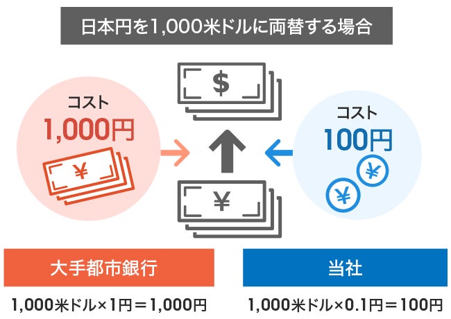 例えば、当社で両替する場合の取引レート以外のコストは1米ドルあたり0.1円(10銭)ですが、大手都市銀行では1~2円程度かかります。