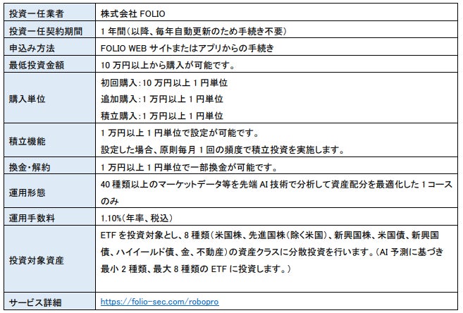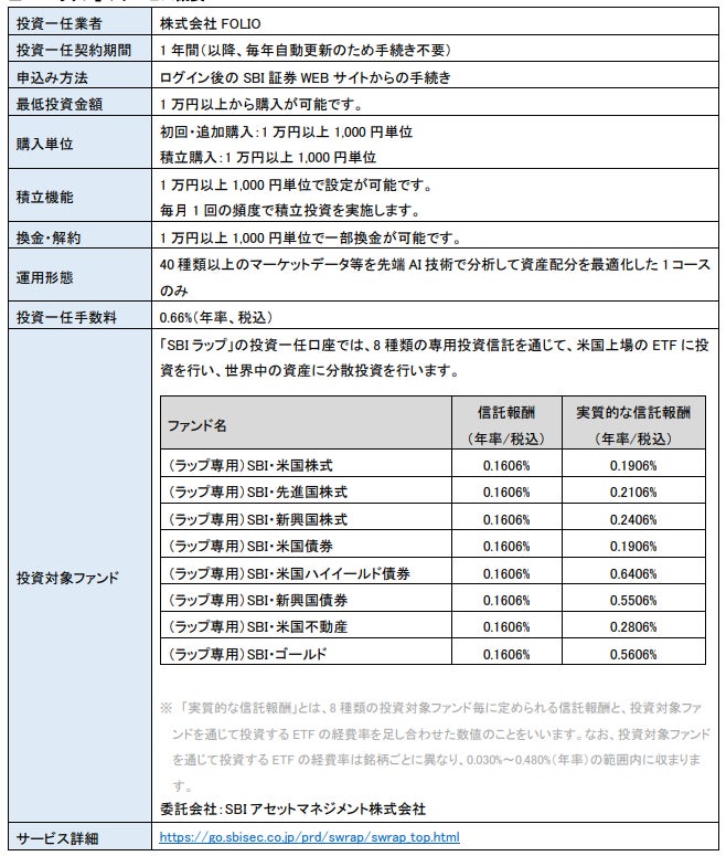 SBI証券とFOLIOは、多様な投資一任サービスの提供を可能にするシステムプラットフォーム「4RAP」の特性を活かし、第1弾商品としてFOLIO が培ってきたAI 運用ノウハウを活用した『AI×投資一任(ラップ)』という新しいジャンルの投資一任サービス「SBIラップ」を提供しています。今後も、「顧客中心主義」のもと、顧客の長期投資に資する第2弾、第3弾となる投資一任サービスを提供すべく、独自の運用ノウハウを有する運用会社との共同開発を進めています。