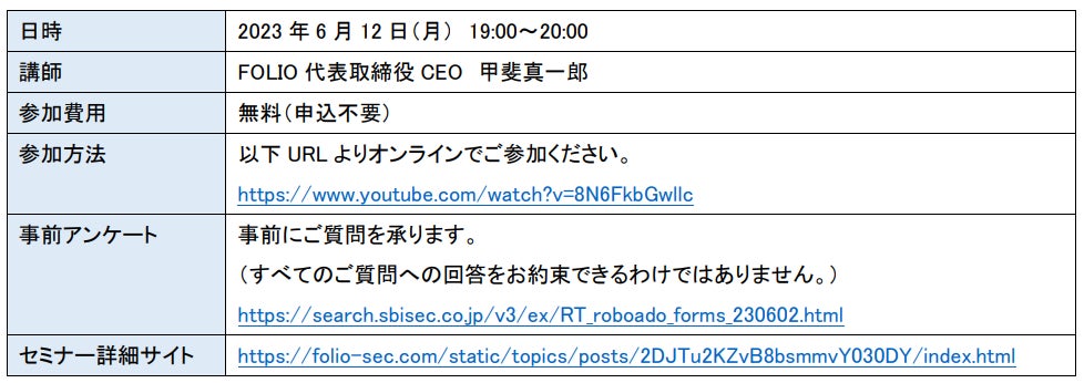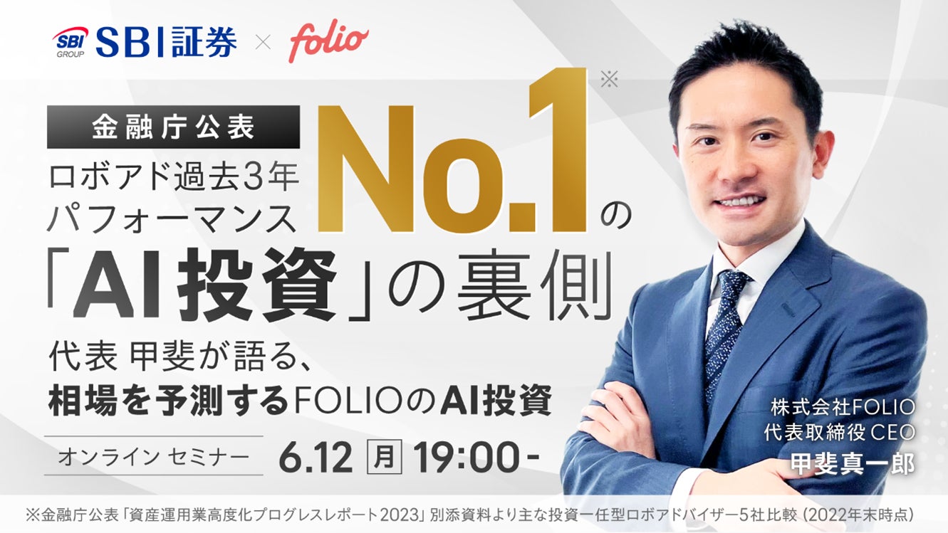 これを記念して、SBI証券およびFOLIOは、お客さまにFOLIOがご提供する「AI投資」の競争力についてよりご理解を深めていただくためのセミナーを、2023年6月12日(月)19時より開催します。