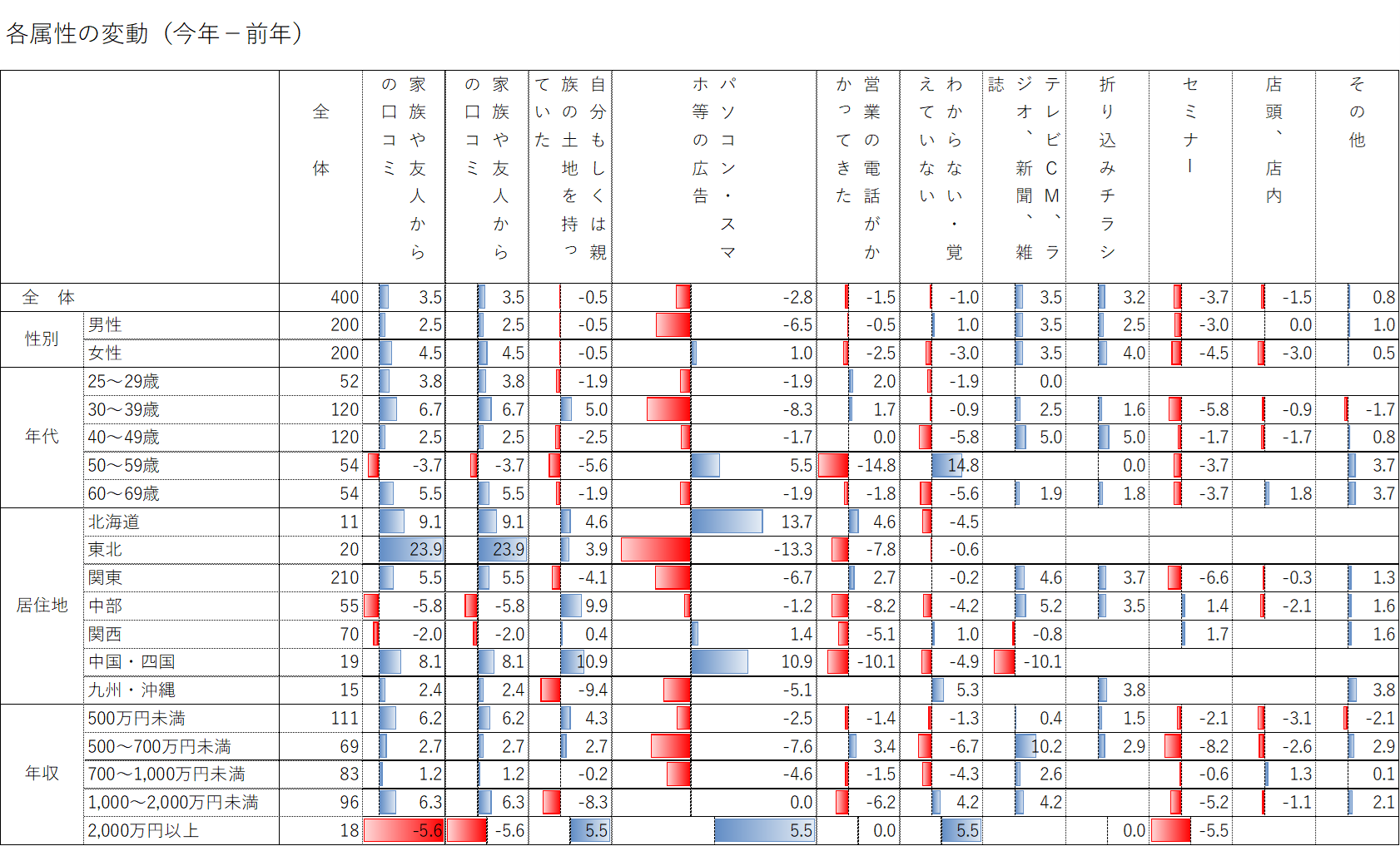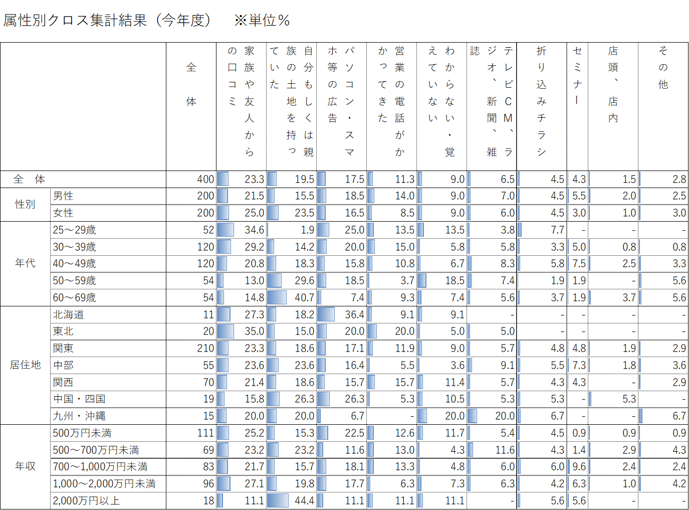 属性別にみると、若年層は「家族や友人からの口コミ」が高く、年代があがると「自分もしくは親族の土地を持っていた」が高くなる傾向がみられます。例年同様の傾向があり、若年層は中長期的な資産形成に関する口コミの影響が大きく、50代前後から相続が本格化するものと考えられます。