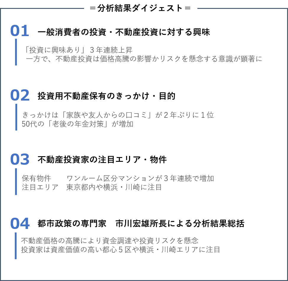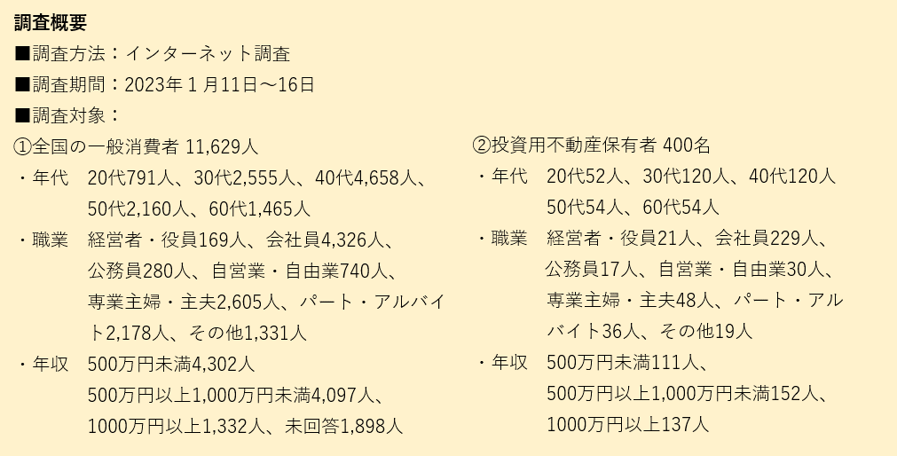 グローバル都市不動産研究所(以下、「当研究所」)では、全国の20代~60代の1万人以上を対象に、投資や不動産投資に対する興味・関心を尋ねる内容と、投資用不動産所有者400人に対して投資目的・投資意向を尋ねる調査を実施しました。