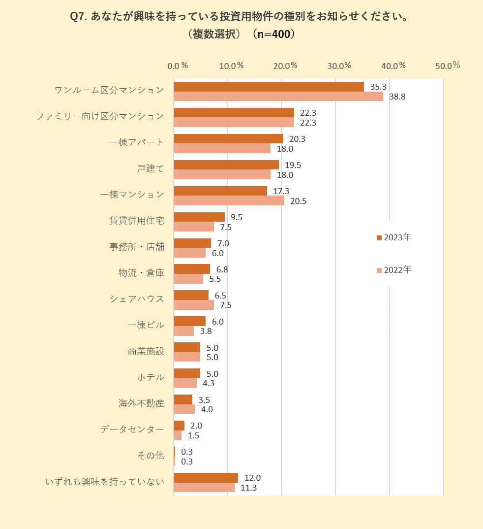 投資用不動産所有者に、興味を持っている投資用物件の種別を尋ねたところ、「ワンルーム区分マンション」がもっとも多く35.3%でした。