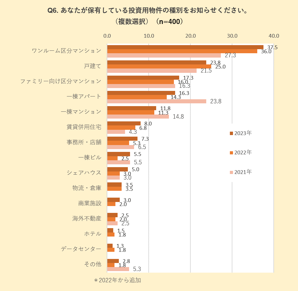 これに「ファミリー向け区分マンション」「一棟アパート」「戸建て」が続いており、レジデンス物件が上位を占めています。