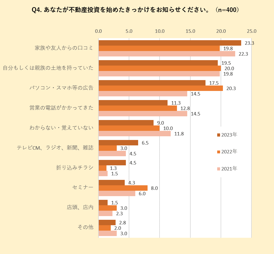 投資用不動産所有者に絞って、不動産投資を始めたきっかけを尋ねたところ、 「家族や友人からの口コミ」 が3.5ポイント増の23.3%で1位でした。