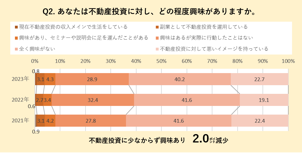 今回で3回目となる不動産投資への意識調査では、46.8%が投資に「興味がある」と回答しており、過去2年間で5.4%増加しました。特に30代~40代、エリアでは関西地区で興味が強く出ました。ただし、不動産投資をするとなると、興味はあるが実際に行動したことはないが3割弱、全く興味がないが約4割あり、すでに不動産投資をしたり、説明会に足を運んでいる人が1割に満たない状況は変わりません。