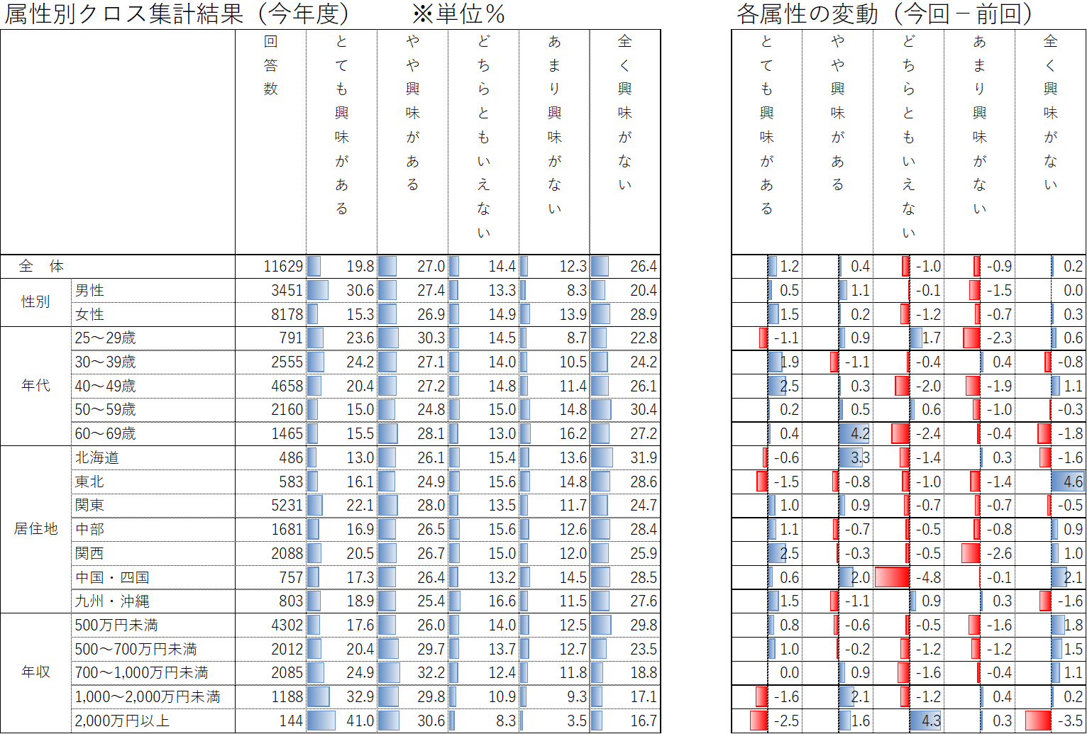 属性別にみると、性別では男性、年代では若年層、年収では高額所得層の方が投資に興味が強い傾向は過去の結果と変わりありません。