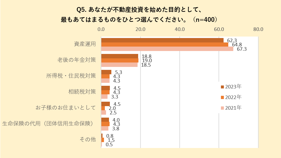 投資用不動産所有者に、不動産投資を始めた目的(最もあてはまるもの)を尋ねたところ、「資産運用」が62.3%で大半を占めています。「資産運用」は一前年の67.3%から5.0ポイント減少しています。「老後の年金対策」が18.8%で続いています。