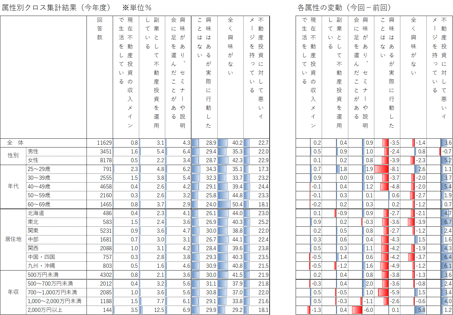 属性別に前年と比較すると、全体的に「不動産投資に対して悪いイメージを持っている」が増えています。後述の分析のとおり不動産価格高騰の影響がありそうです。