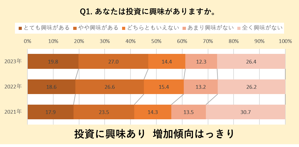 投資に対する興味を尋ねたところ、「とても興味がある」(19.8%)、「やや興味がある」(27.0%)をあわせた46.8%が投資に「興味がある」と回答していました。「興味がある」は、一前年の41.4%から年々増えています。