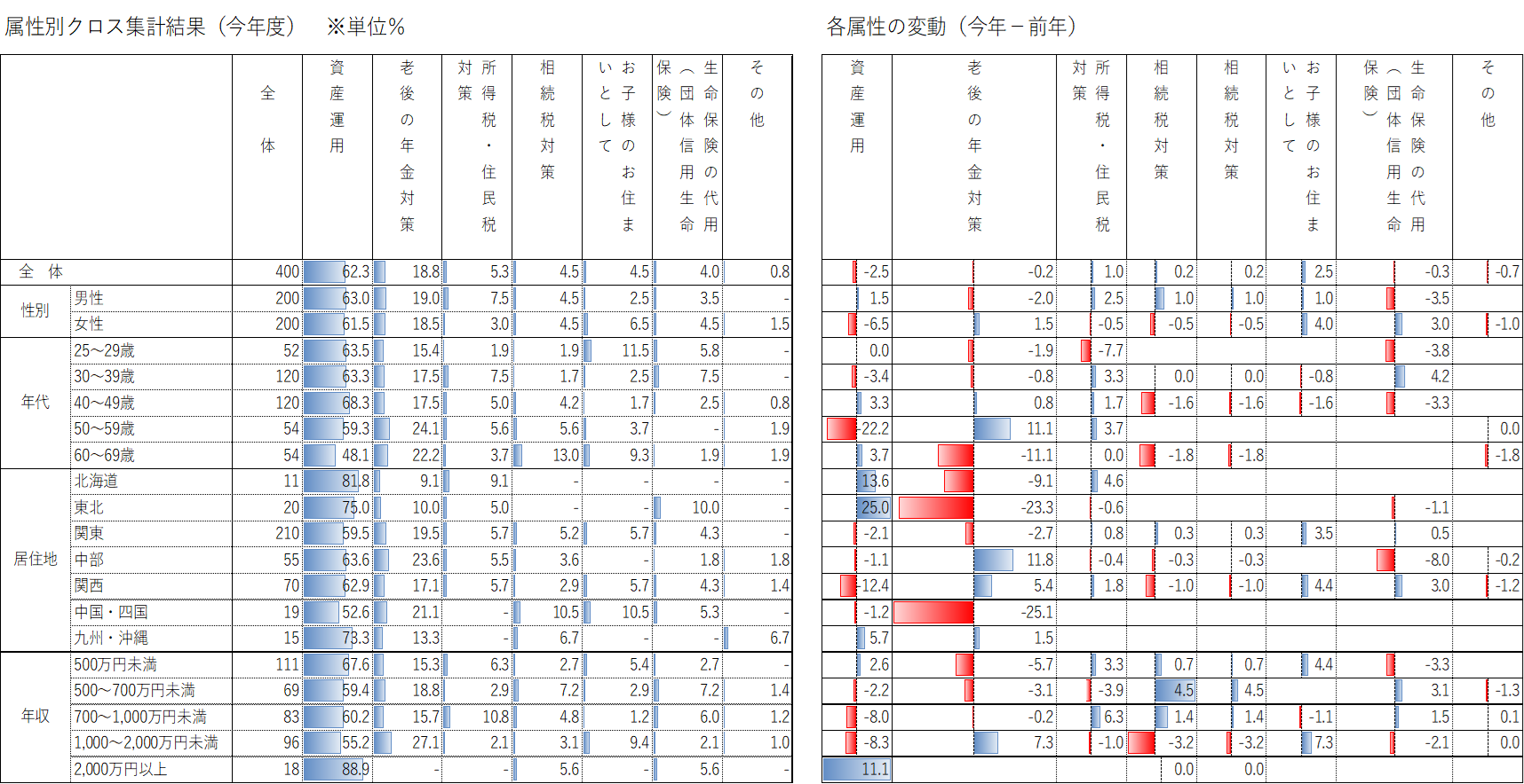 属性別にみると、50代で前年から「資産運用」が減って「老後の年金対策」が増えており、50代から年金問題を意識する人が増加している傾向が確認できました。