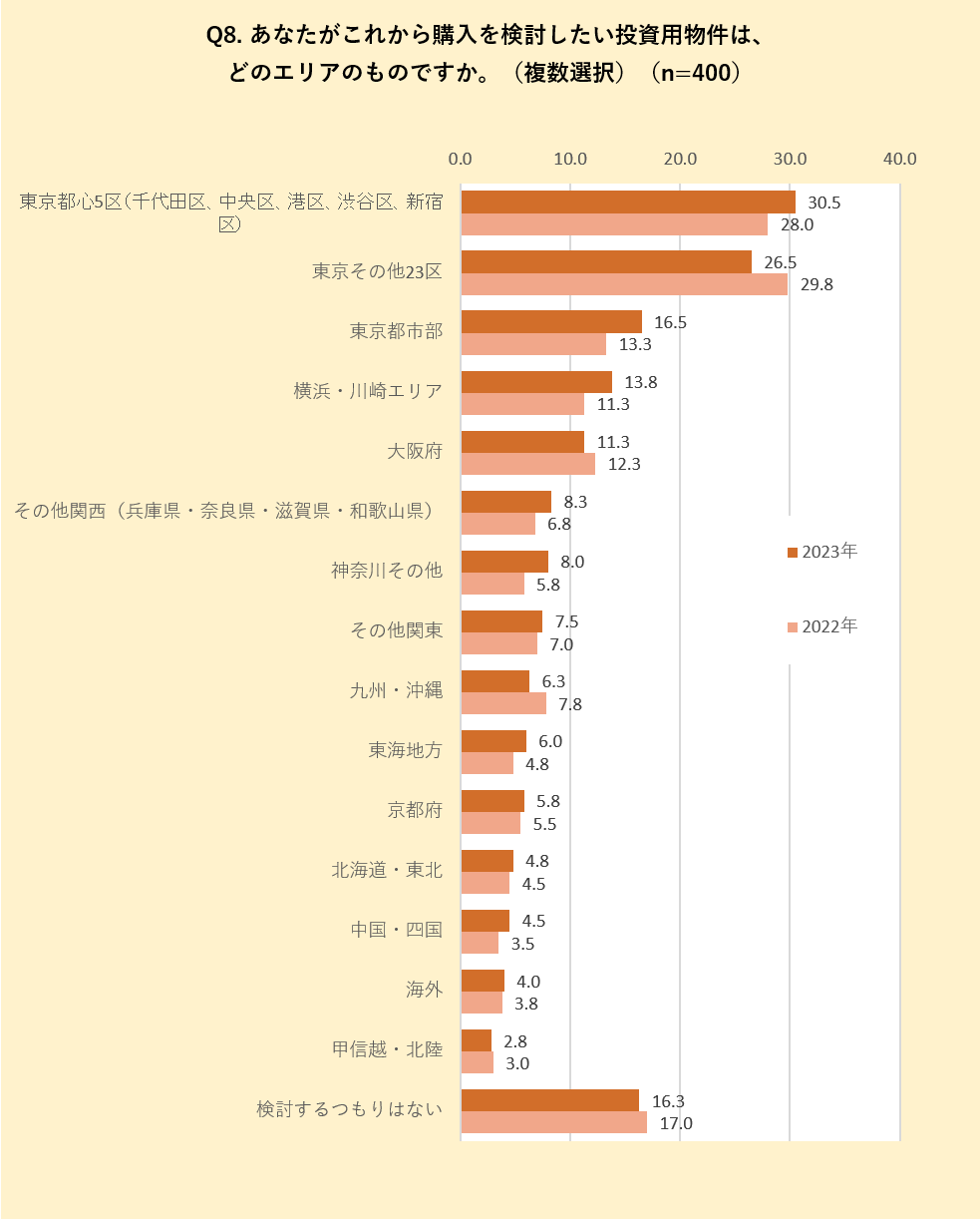 投資用不動産所有者に、購入を検討したい投資用物件のエリアを尋ねたところ、「東京都心5区(千代田区、中央区、港区、渋谷区、新宿区)」がもっとも多く30.5%でした。前年に1位だった「東京その他23区」(26.5%)を抜いています。また人口増加傾向のある「東京都市部」(16.5%)、「横浜・川崎エリア」(13.8%)や「神奈川その他」(8.0%)はそれぞれ2~3㌽増加しています。