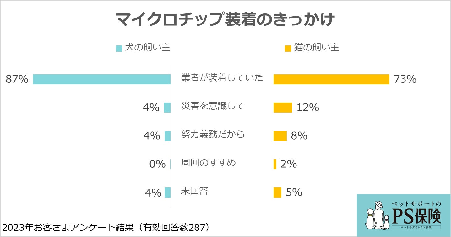 マイクロチップを「装着している」と回答した犬と猫の飼い主(287名)に、そのきっかけを聞いたところ、最も多かった回答は、犬猫の飼い主共に「業者が装着していた」(犬87%、猫73%)でした。