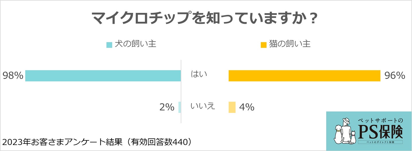 犬と猫の飼い主にペットに装着するマイクロチップについてたずねたところ、「はい」(知っている)と回答したのは、犬の飼い主で98%、猫の飼い主で96%となり、ほぼ全員が知る存在となりました。