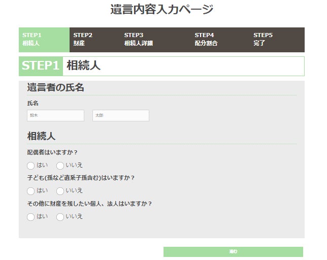 「遺言書AI」のメインターゲットは高齢者です。高齢者も日常的にインターネットを閲覧する時代ですが、字が細かいサイト・アプリは分かりにくく、敬遠されてしまいます。パソコン、スマホを問わず、UIのわかりやすさにこだわったシンプルなWEBサイトの質問に答えることで、遺言書のPDFが自動出力できます。