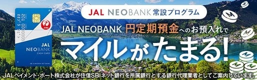 住信SBIネット銀行株式会社(本社:東京都港区、代表取締役社長(CEO):円山 法昭、以下「住信SBIネット銀行」という)とJALのグループ会社である、JALペイメント・ポート株式会社は、JALマイレージバンク(以下、「JMB」という)会員専用のネット銀行口座「JAL NEOBANK」(※)への円定期預金のお預入れでマイルがたまる「円定期預金常設プログラム」を、2023年6月30日(金)より開始します。