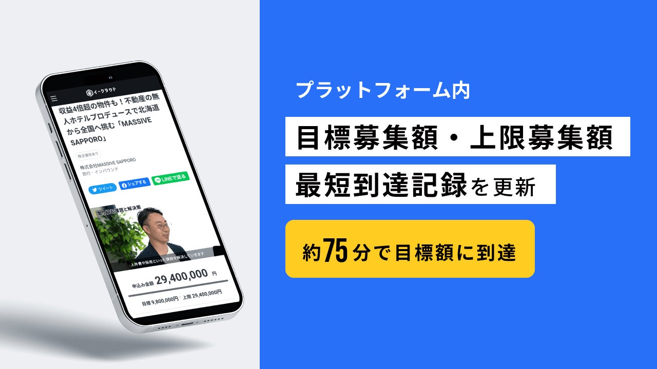 株式投資型クラウドファンディングサービスを提供するイークラウド株式会社(東京都中央区、代表取締役:波多江直彦、以下「イークラウド」)」は、2023年6月8日より第22号案件「MASSIVE SAPPORO」の募集を開始し、約75分後に申込金額が目標募集額の980万円に到達、約8時間34分後には上限募集額の2,940万円に到達しました。これはサービス開始以来、最短時間での目標募集額・上限募集額到達となります。