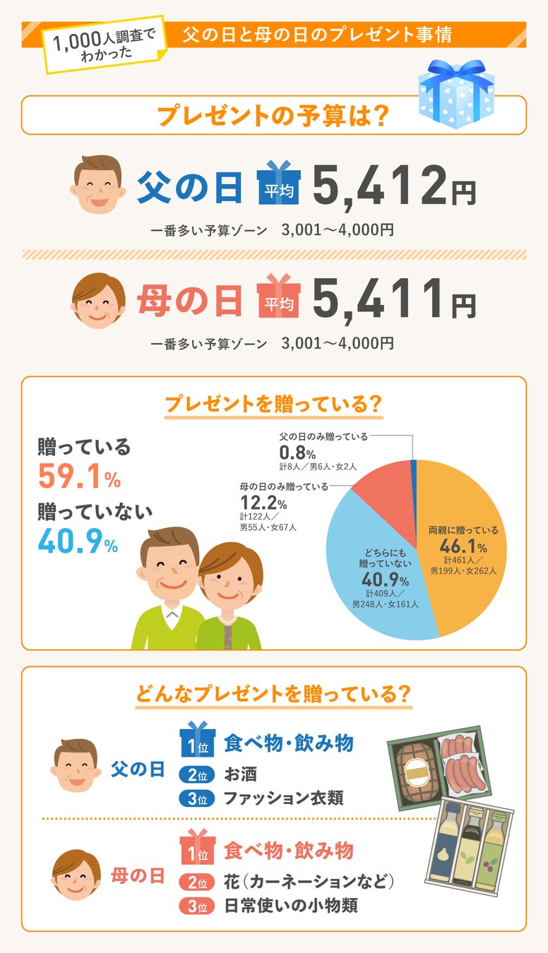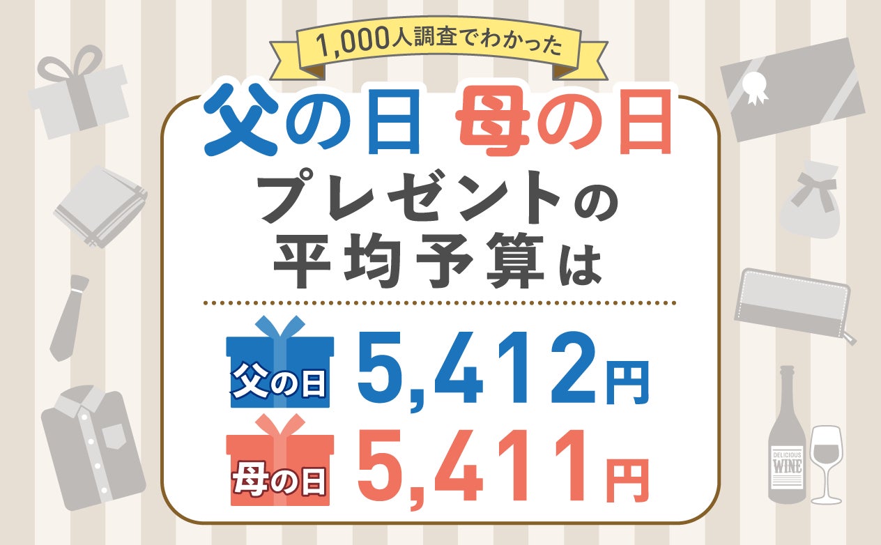 1,000人アンケートの結果、父の日のプレゼント平均予算は5,412円、母の日は5,411円。一番多い予算ゾーンは、いずれも3,001~4,000円でした。