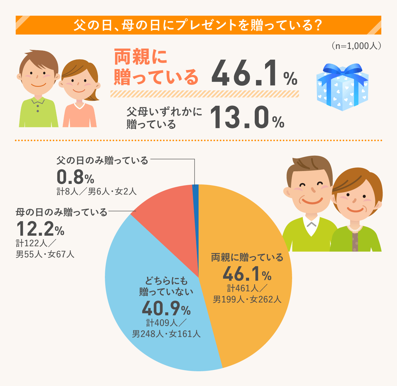 両親にプレゼントを贈っているのが46.1%、一方でどちらにも贈らない人は40.9%いることがわかりました。父の日と母の日に贈り物をするかどうかは二極化しているようです。