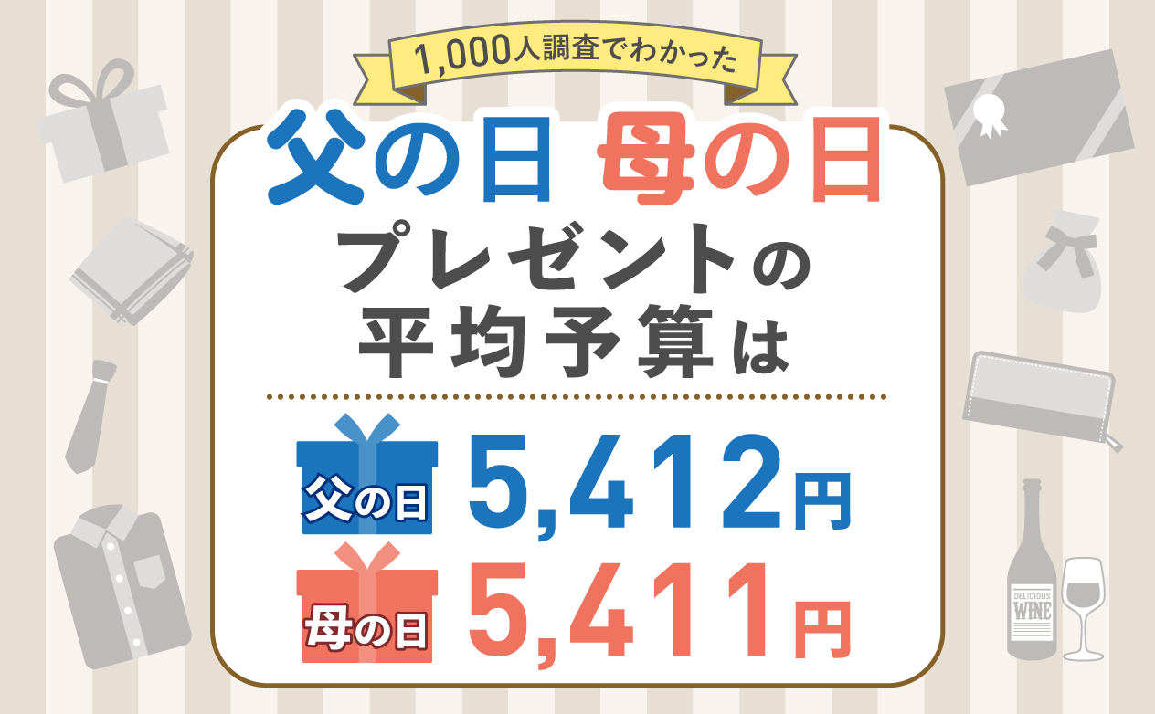 1,000人アンケートの結果、父の日のプレゼント予算の平均は5,412円、母の日は5,411円とわずか1円差であることがわかりました。「差はない」ととらえて良い結果といえるでしょう。