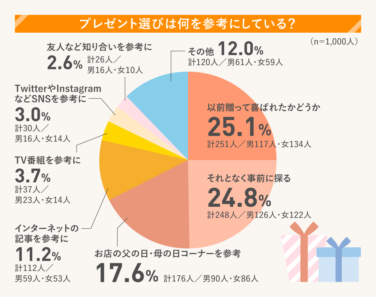 また、プレゼント選びの参考では「以前贈って喜ばれたかどうか」と「それとなく事前に探る」の割合の合計が約半数を占めています。