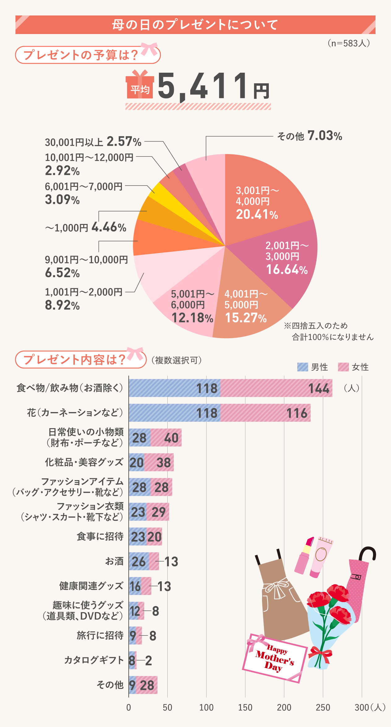平均予算は5,411円で、3,001~4,000円が最も多かった予算ゾーンでした。人気のプレゼントについては、「食べ物/飲み物(お酒除く)が1位、次いで「花(カーネーションなど)」、3位が「日常使いの小物類」でした。