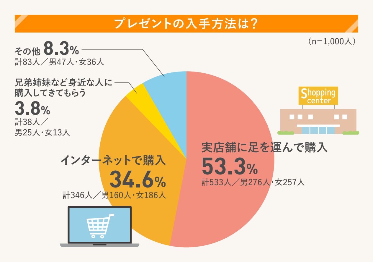 「実店舗に足を運んで購入」が半数以上を占める結果となりました。実物をしっかり見定めて購入していることから、「確実に喜んでほしい」という心理が浮かんできます。