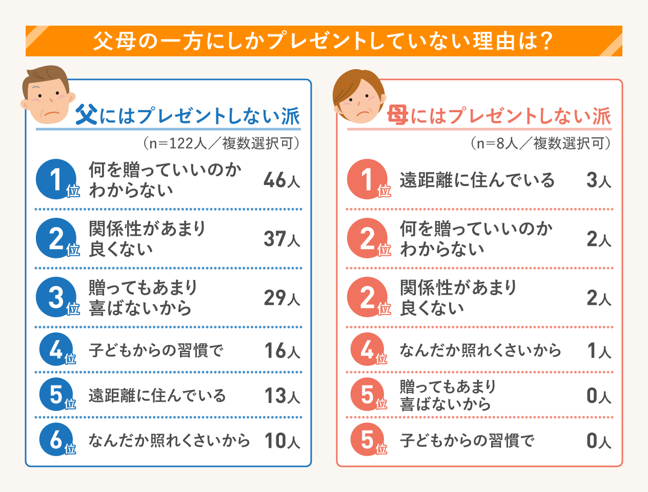 プレゼントを贈っているかの質問には、「両親に贈っている」が46.1%、「どちらにも贈っていない」が40.8%と二極化。また、どちらか一方にだけ贈っているひとは13%おり、母のみが12.2%、父のみが0.8%で、その理由についての調査結果もまとめています。