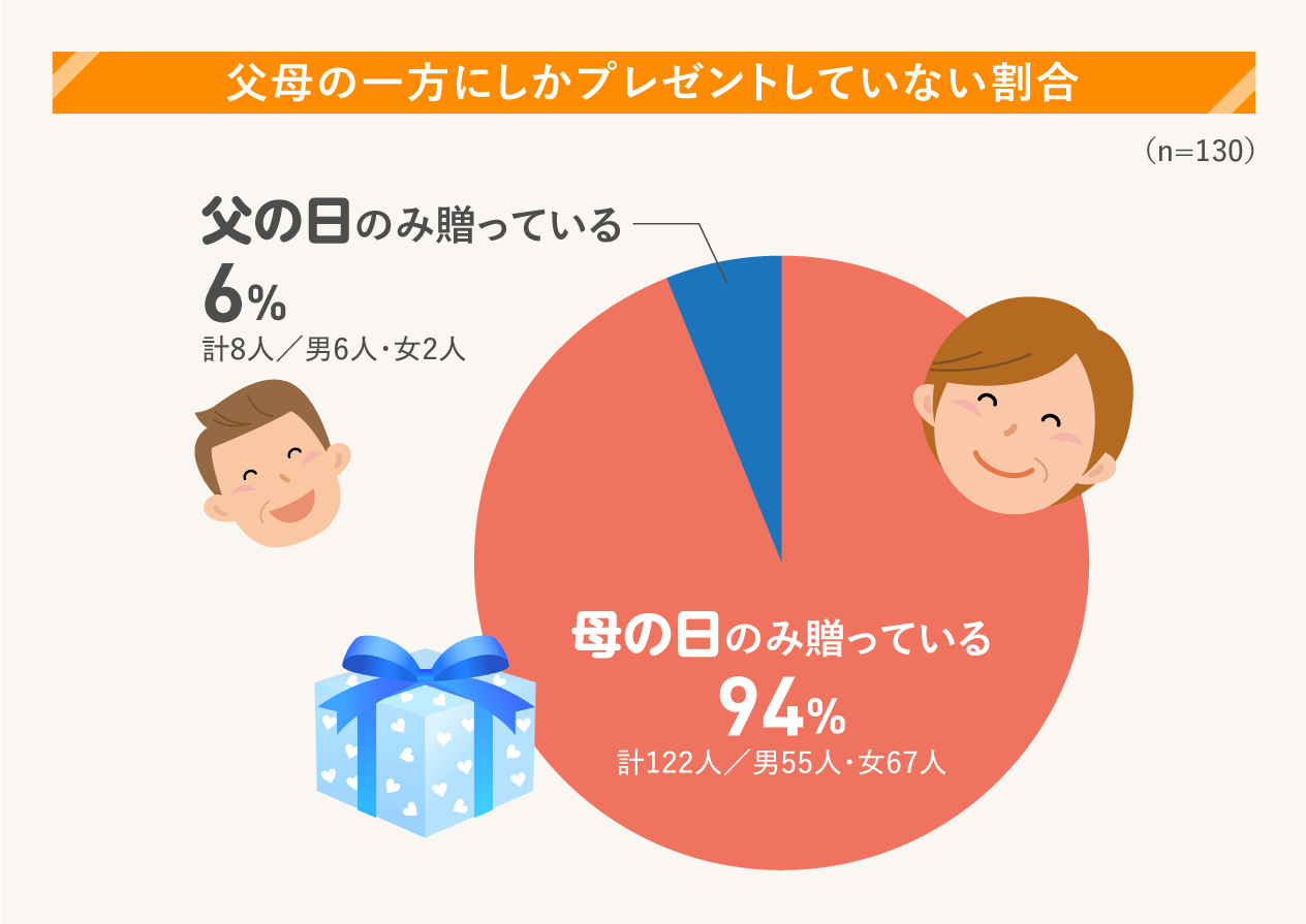 さらに、どちらか一方にしか贈っていないひとの中では、母にしか贈っていないが94%と、父の日は大苦戦。
