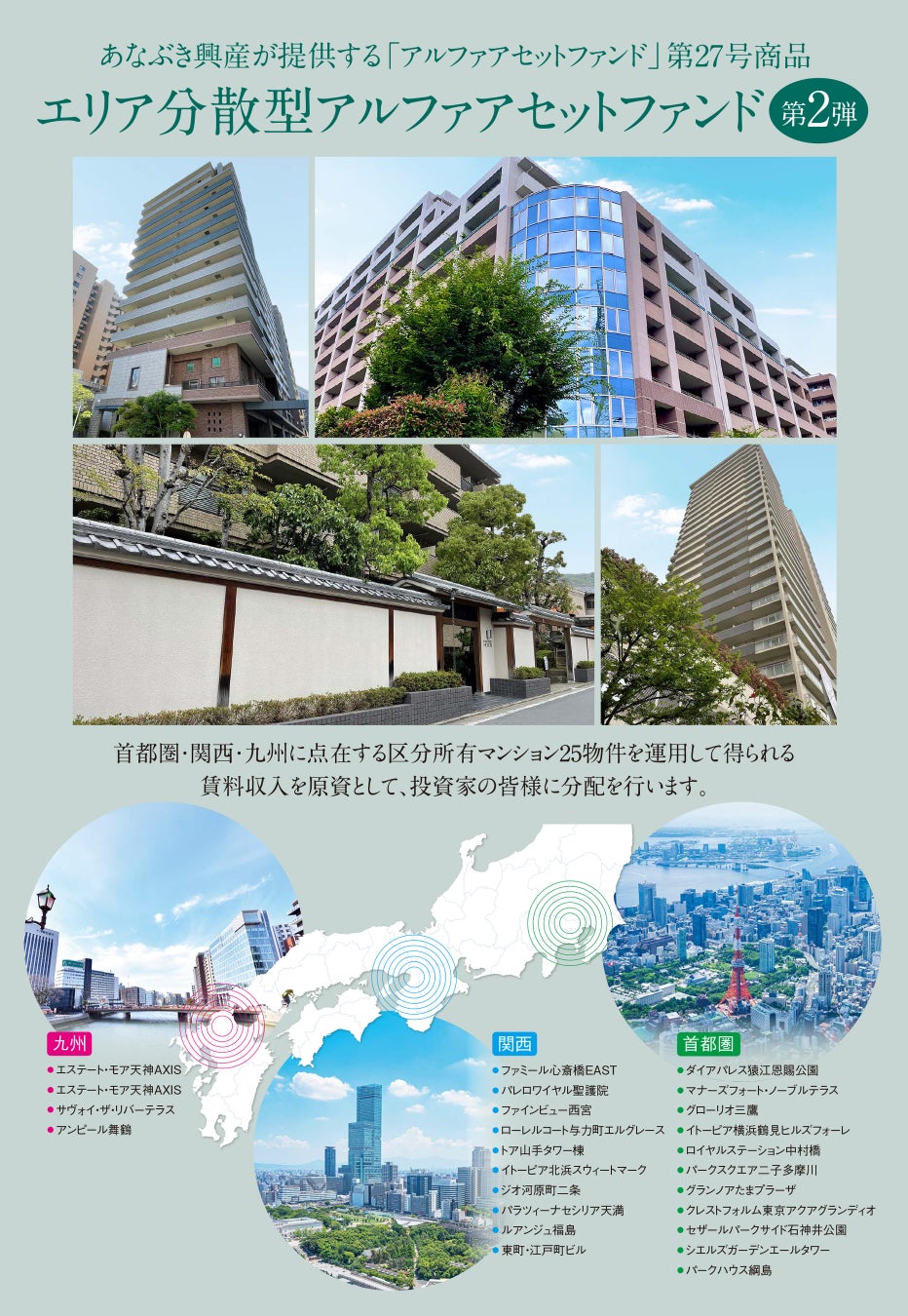 『エリア分散型アルファアセットファンド第二弾』は、穴吹興産が全国で保有する物件の中から首都圏・関西・九州に点在する優良物件25物件が対象。また、全25物件が新耐震基準の物件となっており、全国に分散した物件を厳選することで局地的な災害リスクなども抑えることができます。