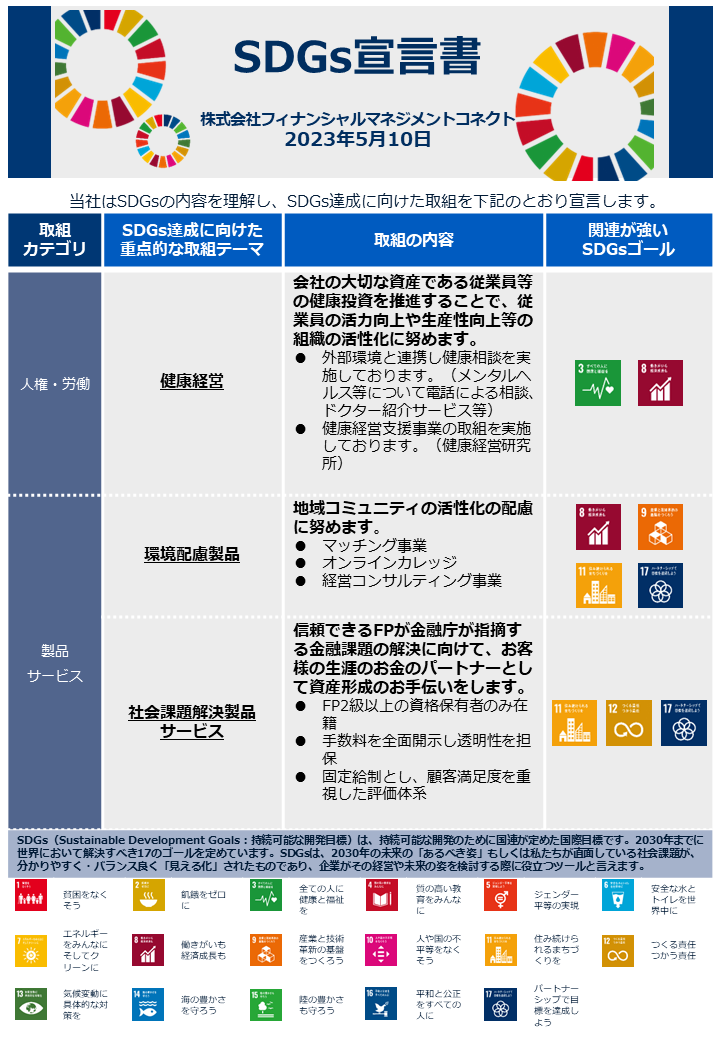 この度株式会社フィナンシャルマネジメントコネクトは株式会社七⼗七銀⾏のSDGs⽀援サービスにより⾃社の強みと課題を再認識するとともに、SDGs達成へ向けた取り組みを宣⾔いたしました。