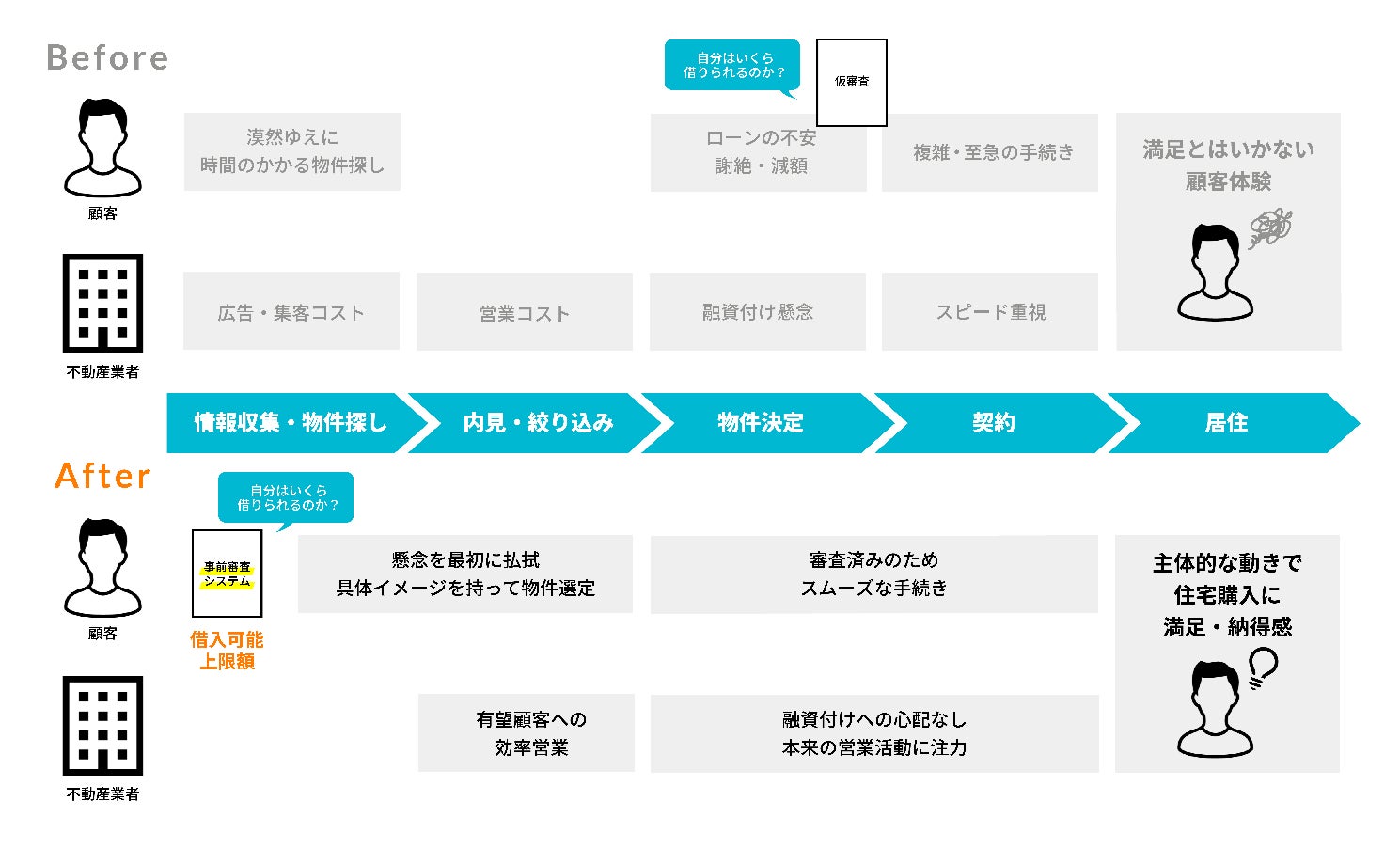 従来の住宅購入プロセスにおいて、お客さまは、まず購入したい物件を決めた後、不動産会社等のサポートの元、住宅ローンの仮審査・本審査を行うという流れが一般的となっており、お客さまご自身が購入できる物件の価格帯が明確でないまま購入検討を進め、いざ物件を決定した後に時間のない中で、お金に関する重大な意思決定を行わなければならないといった課題が生じておりました。また、不動産会社等においては、不動産ポータルなどから紹介されたお客さまの住宅購入に関わる情報収集を行う方を含め、接客や商談を進めることによる営業コストの増加が大きな課題となっております。